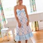 The Abbi Mini Strap Dress in Cream and Blue features delicate halter-style straps and a playful ruffle hem, combining comfort with a flattering silhouette. Its lightweight design makes it perfect for warm days, while the ruffle detail adds a touch of feminine charm. Ideal for casual outings or special occasions, this dress offers both style and ease, helping you feel confident and effortlessly chic.