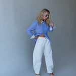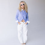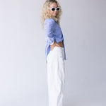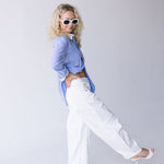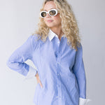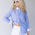 Update your wardrobe with our Alexis Striped Shirt in Blue. Effortlessly chic and comfortable, its button down design and hem details add a touch of style to any outfit. Embrace a classic look that will keep you looking and feeling your best all day long.