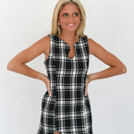 This Alix Plaid Tweed Mini Dress in black and white combines classic elegance with modern style. Crafted from textured tweed, its sleeveless design and subtle cut-out detail add a fresh, flattering touch. Perfect for dressing up or down, this dress offers both comfort and confidence for any occasion.