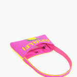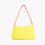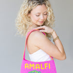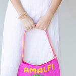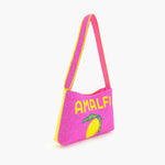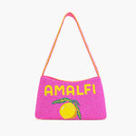 Elevate your style with our Amalfi Beaded Shoulder Bag! This curvy baguette bag features a durable hatch-patterned yellow woven jacquard, adorned with a vibrant "Amalfi" beaded lettering, yellow lemon, and bright pink embellishments. Its top magnetic closure and fully beaded shoulder handle offer secure storage and a chic touch. Inside, you'll find a fuchsia poly lining and zipper pocket for convenience. Size: 11" x 7".