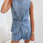 Elevate your casual wardrobe with the Amanda denim Set in denim. This stylish combination of a denim vest and matching shorts offers comfortable wear and effortless coordination. The rich mocha tone adds warmth and versatility, making it easy to dress up or down for various occasions. Perfect for those seeking an easy, polished look without sacrificing comfort.