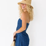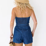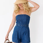 The Amanda Strapless Romper in denim offers a flattering belted design that accentuates your waist while providing a comfortable fit. Its open shoulder style adds a touch of elegance and breathability, perfect for warm days. This romper combines style and ease, making it a versatile choice for casual outings or relaxed gatherings.