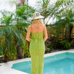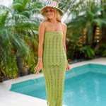 Embrace effortless beach style with the Amy Crochet Knit Skirt Set in Avocado. This boho-inspired duo features a delicate scalloped tank top with adjustable straps for a perfect fit, paired with a high-waisted maxi skirt that flatters your curves with its fit-and-flare silhouette and scalloped edges. Lightweight and comfortable, this set is designed to keep you cool and confident on sunny days by the shore.