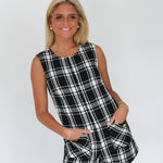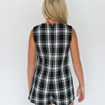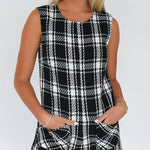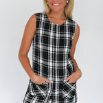The Amy Tweed Romper in black and white offers a chic and comfortable look with its sleeveless design and round neckline. Crafted from tweed fabric, it delivers a textured style that stands out while providing pockets for added convenience. This romper is perfect for those seeking an easy, polished outfit that supports your busy lifestyle with both flair and function.