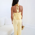 This Anna Eyelet Knit Set in Lemon combines a button-front eyelet knit pant with a matching halter top for a fresh, coordinated look. Crafted from breathable knit fabric, it offers comfortable wear with subtle texture and charming eyelet details. Perfect for warm days, this set keeps you stylish and cool while providing effortless outfit coordination.