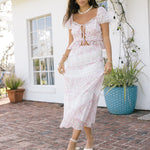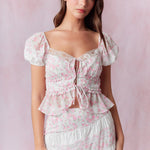 Introducing our Anna Puff Sleeve Top - Pink, designed with delicate lace and a front tie detail for a romantic touch. The shorter puff sleeves add a touch of playfulness to this elegant top. Perfect for dressing up or down, it effortlessly combines style with comfort.