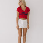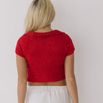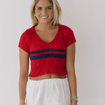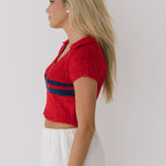 Embrace casual elegance with our Ansley Knit Crop Top in vibrant red. This short-sleeve polo features a supremely soft knit fabric that feels wonderful against your skin. The flattering cropped silhouette is enhanced with sporty contrast stripes across the chest, creating a stylish athletic-inspired look that pairs perfectly with high-waisted bottoms for any casual occasion.