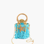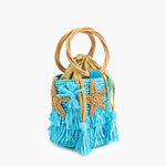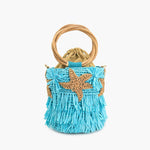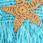 This round bucket bag, made from natural raffia, features charming starfish motifs and playful raffia fringes that add movement and seaside flair. It includes a drawstring closure complemented by a wooden handle, along with a long chain strap for versatile crossbody wear. Fully lined with beige polyester, it offers a stylish and durable interior to protect your essentials. Measuring 7" x 6" x 6", this bag is a perfect companion for beach days and sunny adventures.
