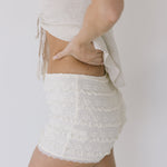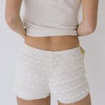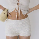 Get ready to turn heads with our Ari Ruffle Mini Shorts in white! These micro shorts feature delicate lace ruffles that add a touch of femininity to any outfit. Stay cool and stylish this summer with these must-have shorts.