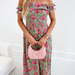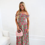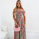 Ariel Smocking Off The Shoulder Maxi Dress - Green/Pink