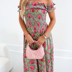 Embrace effortless vacation style with the Ariel Smocking Off The Shoulder Maxi Dress. Its smocked bodice ensures a comfortable, flattering fit, while the off-the-shoulder design adds a touch of breezy elegance. The flowing maxi length in vibrant green and pink hues makes it perfect for warm-weather getaways, keeping you cool and stylish from beach strolls to sunset dinners.