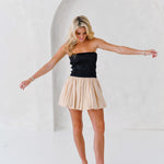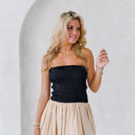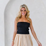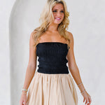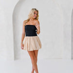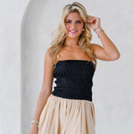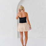 Introducing the Aubrey Smocking Detail Mini Dress in Black Beige. This playful strapless dress boasts a textured smocked bodice that adds shape and a voluminous balloon silhouette, perfect for both casual outings and special occasions. Add some drama to your wardrobe with this chic and modern piece.