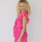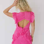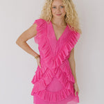 This flirty pink mini dress features cascading ruffles and a playful cutout back detail. The v-neck design creates a flattering silhouette and is perfect for any occasion. Keep it stylish and chic with the Avery Ruffle Mini Dress.