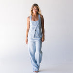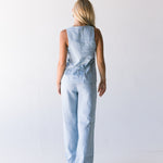 Stay cool and stylish this summer with our Bea Linen Vest Top in a gorgeous light blue color. The sleeveless design and back tie waist make it perfect for any occasion. Feel confident and comfortable while looking effortlessly chic. Upgrade your wardrobe with this must-have piece.