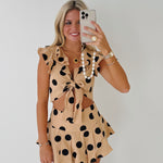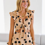 Stay on trend with our Callie Front Tie Top! This stylish top features ruffle trimmed cold shoulder details and a front tie design. Perfect for adding a touch of fun to your everyday look. Available in versatile beige and black.