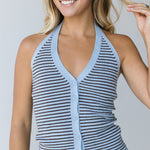 This Cami Striped Halter Top is perfect for a casual day out or a stylish night out. Featuring a halter neck design and a button down front, this top offers both comfort and style. The blue and brown stripes add a touch of color and personality to any outfit.