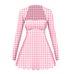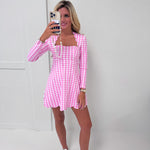 Our stunning Caroline Everyday Fit Dress in Pink Gingham - perfect for any occasion! This dress boasts long sleeves with scalloped detailing and a flattering squared neck. Stay stylish and comfortable all day long.