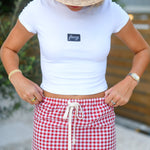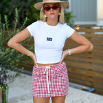 Embrace casual elegance with our Clara Drawstring Mini Skirt in vibrant Ruby. The charming gingham print pairs perfectly with the comfortable elasticized waistband and adjustable drawstring for a personalized fit. Its straight silhouette and unlined design offer breathable comfort for all-day wear, making it an effortless addition to your wardrobe.