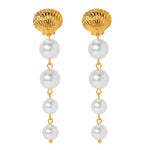These Clara Shell Pearl Drop Earrings are crafted from 18k gold PVD plated 316L stainless steel, ensuring they remain tarnish-free and gentle on sensitive skin. Measuring 2.5 inches (6.55 cm) in length, they feature a secure post closure for comfortable wear.