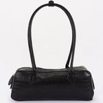 This Croc Embossed Barrel Bag showcases the timeless barrel silhouette combined with a crocodile-textured finish. Equipped with a top handle for convenient carrying and a zipper closure to keep your belongings safe, its structured form and detailed texture offer an elegant and polished appearance.