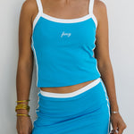 Discover the Fancy FitFlow tank in Poolside, designed for comfort and style. Featuring a subtle stripe in a complementary white tone along the side, this tank offers a flattering fit that moves with you. Perfect for active days or casual outings, it combines practicality with a fresh, vibrant look to keep you feeling confident and supported.