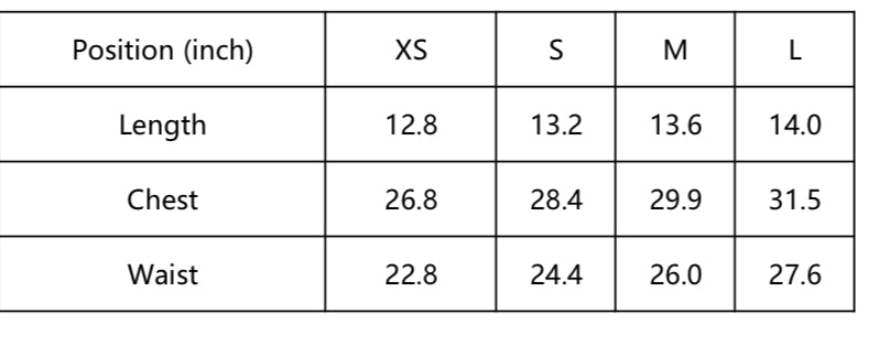 XS: 31”-33” (bust) / 24”-26” (waist)