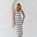 Elevate your style with our Madi V-Neck Sweater Midi Dress. Featuring a chic stripe design and v-neck neckline, this sleeveless dress is the perfect addition to your wardrobe. Stay cozy and stylish all day with this versatile and comfortable midi dress.