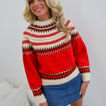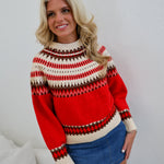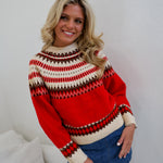 Stay warm and stylish this winter with the Mallie Crewneck Pullover Sweater in red. Featuring a cozy Fair Isle pattern and a traditional Nordic-inspired yoke, this sweater adds a festive yet timeless charm to your wardrobe. Its comfortable fit makes it perfect for layering on chilly days, helping you embrace the season with warmth and classic style.