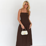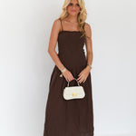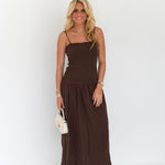 This Maria Ruched Midi Dress in rich chocolate brown features a flattering drop waist design and adjustable straps for a personalized fit. Its elegant silhouette enhances comfort and style, making it a versatile choice for any occasion