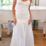 This Martyn Embroidered Lace Maxi Dress in cream features stretchy lace and delicate embroidery for a comfortable yet elegant fit. Adjustable shoulder straps allow you to customize the fit to your shape, while the dropwaist chiffon skirt adds graceful movement and a flattering silhouette. Perfect for special occasions, this dress combines style and comfort to help you feel confident and beautiful.