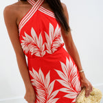 Embrace effortless style with the Mary Printed Halter Mini Dress in Tomato Red. Featuring a tropical print and a flattering criss-cross halter neckline, this dress offers a breezy, open-back design with a self-tie detail for a customizable fit. Perfect for warm days and lively evenings, it combines comfort and charm to keep you feeling confident and supported wherever you go.