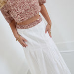 This cropped zebra top features a subtle V-cut neckline in a brown and cream zebra print, designed to perfectly complement the Mckayle double layer skirt. Its fresh, tailored fit offers a flattering silhouette, making it an ideal match for a coordinated and stylish look that’s both playful and polished.