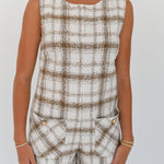The Miley Tweed Romper in ivory and mocha offers a chic and comfortable look with its sleeveless design and round neckline. Crafted from tweed fabric, it delivers a textured style that stands out while providing pockets for added convenience. This romper is perfect for those seeking an easy, polished outfit that supports your busy lifestyle with both flair and function.