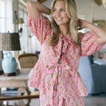 Elevate your summer wardrobe with our Mindy Tie Front and Shorts Set in Pink! This stylish set features a tie front top with charming puff sleeves and matching shorts, creating a flirty and fun ensemble perfect for any warm weather occasion. Stay cute and comfortable with this must-have set.