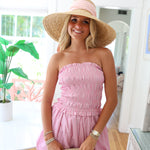 This Missy Strapless Balloon Mini Dress in pink features a flattering shirred bodice and playful balloon sleeves, creating a stylish and comfortable fit. Its strapless design highlights your shoulders, perfect for warm days or special occasions. The striped pattern adds a fun, youthful touch, making it an easy choice for a confident, chic look.