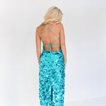 This turquoise midi dress features high-shine disc sequins that catch the light beautifully. Its delicate spaghetti straps roll over the shoulders and cross at the open back, tying securely for a comfortable, adjustable fit. Perfect for making a confident statement at any event, this dress combines eye-catching sparkle with a flattering silhouette.