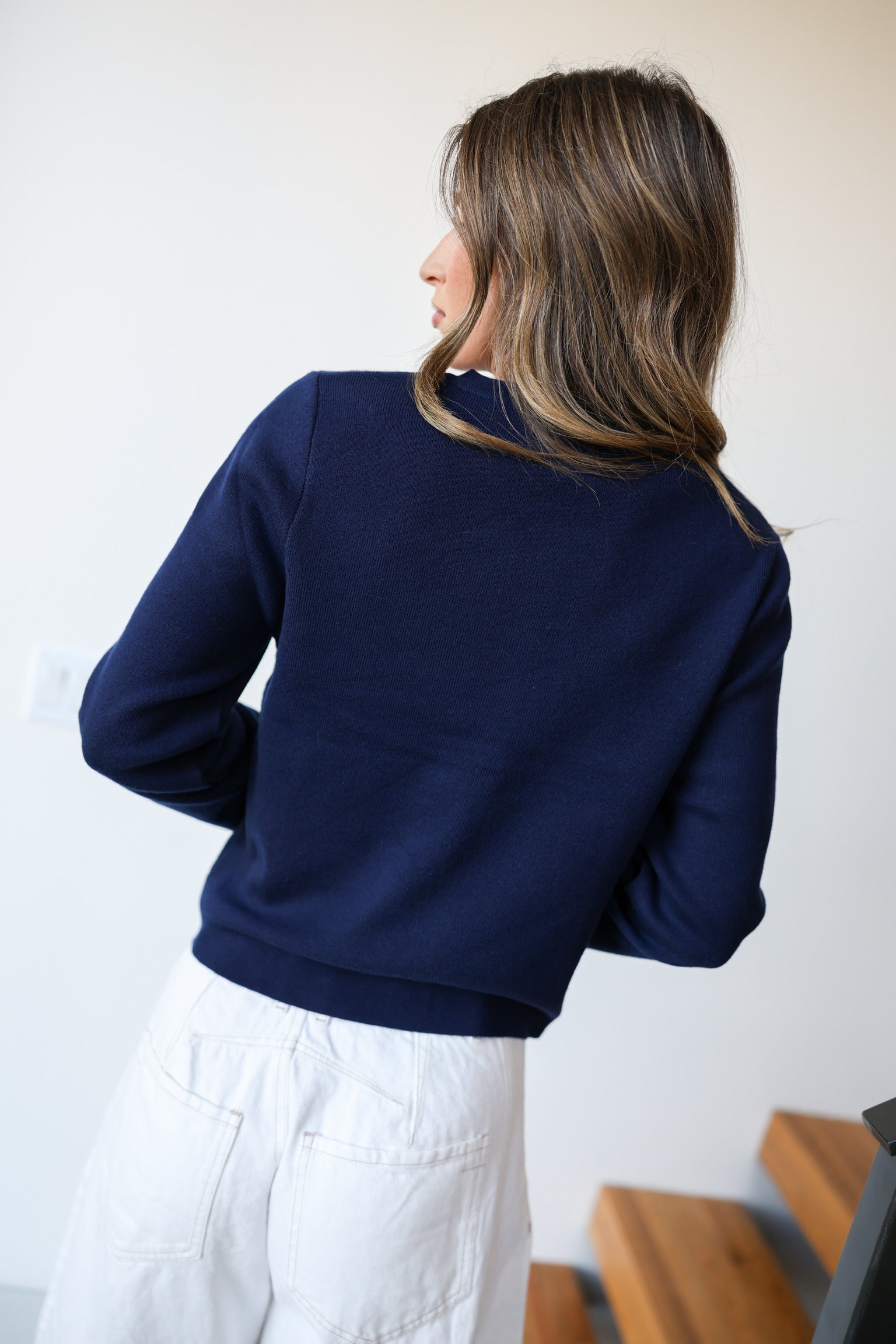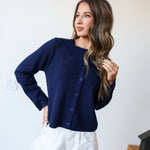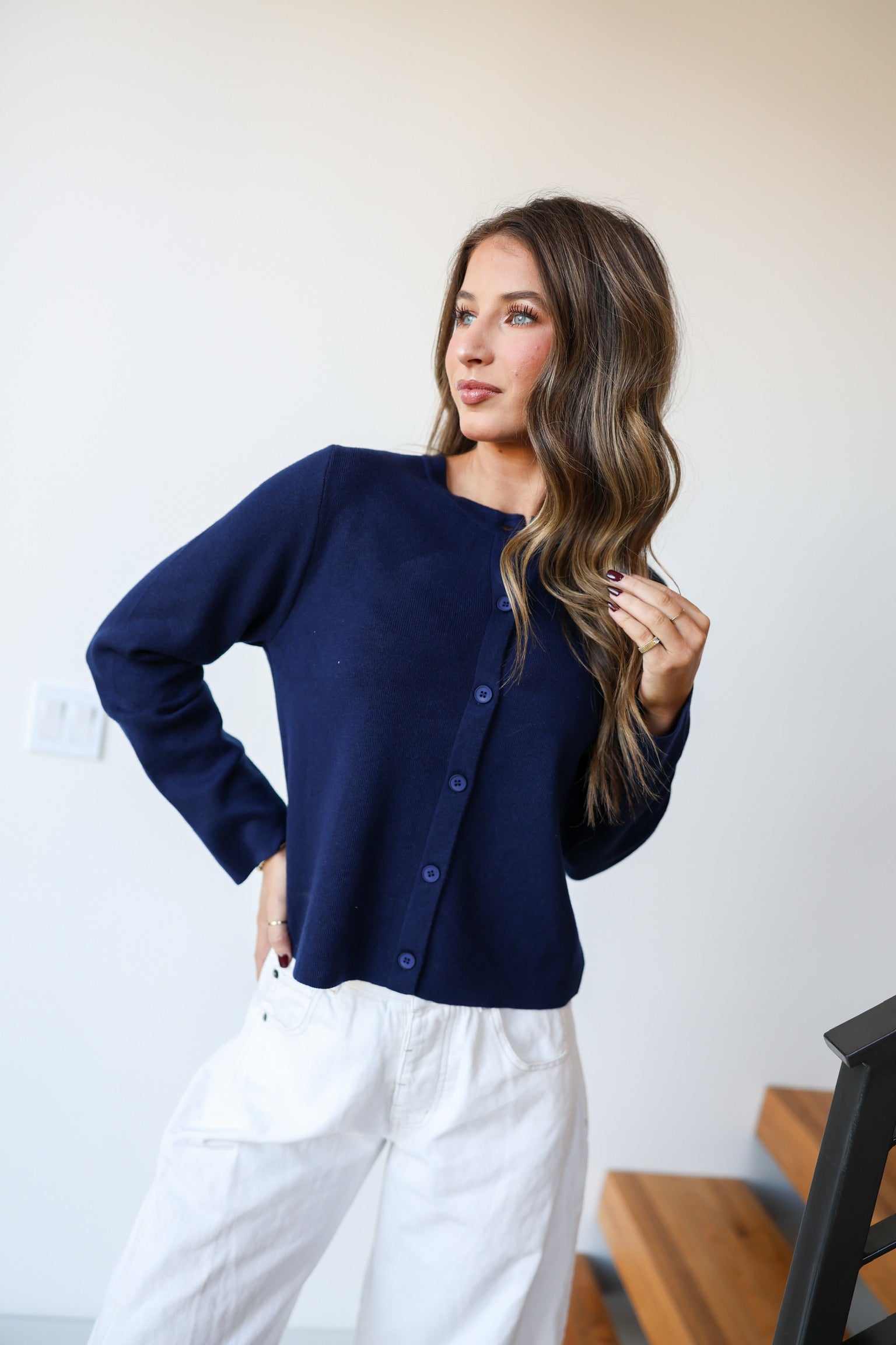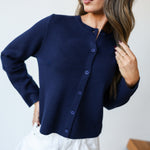 This cozy and cute fitted round neck cardigan features a soft knit fabric in a fresh navy color. Designed with a convenient front button closure, it offers both comfort and style for everyday wear. Perfect for layering, it helps you stay warm while adding a charming touch to your outfit.