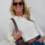 This long sleeve button-down knit top features a classic collar for a polished look. Its soft, stretchy fabric ensures comfortable all-day wear, while the button-down front offers easy styling and adjustable coverage. Perfect for layering or wearing on its own, this versatile piece supports a seamless transition from casual to refined outfits.