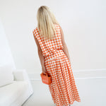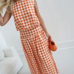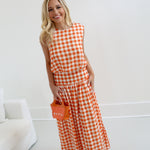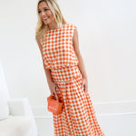 Elevate your game day look with the Ollie Gingham Skirt Set in orange. This set features a bubble-style top paired with a flowing maxi skirt, combining comfort and style effortlessly. Perfect for cheering on your team while staying chic and comfortable all day long.