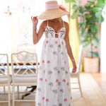 Embrace effortless style with the Paloma Palm Tree Maxi Dress in White Multi. Crafted from textured woven fabric, this dress features a charming palm tree print that brings a touch of tropical elegance. The cross-tie braided halter neck adds a unique, flattering detail, ensuring comfort and a secure fit. Perfect for warm days or beachside outings, this maxi dress combines breezy sophistication with a supportive design to keep you feeling confident all day long.