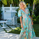 Peyton Printed Puff Sleeve V-Neck Midi Dress - Turquoise
