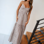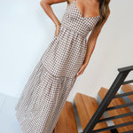 Embrace charm and comfort with the Polly Gingham Tiered Maxi Dress in brown. Crafted from classic gingham fabric, this dress features adjustable spaghetti straps and a smocked back for a personalized fit. The tiered skirt allows for graceful movement, while the lined bodice ensures comfort and coverage. Whether at a casual outing or a special event, this dress offers effortless, feminine style you can rely on.