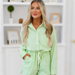 Rae Belted Romper - Apple Green Pinstripe
