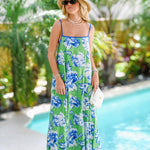 The Randi Floral Maxi Dress in green, white, and blue offers a comfortable and stylish choice for transitioning from a beach day to a relaxed dinner. Its flowing maxi length and vibrant floral print provide an effortless, elegant look that keeps you feeling confident and comfortable as the evening sets in. Perfect for those who want a versatile dress that combines casual ease with a touch of sophistication.