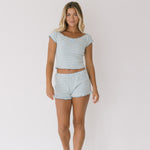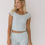 Embrace comfort and style with our Raya Striped Ruffle Set in Cloud. This charming two-piece ensemble features playful striped shorts with a feminine ruffle hem paired with a flattering off-shoulder top. Perfect for warm weather outings or casual gatherings, this set offers effortless coordination while keeping you cool and confident all day long.