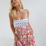 The black and white polka dot print paired with the spring trip floral print creates a fun and playful look. The square neck, adjustable straps, and pleated bust add flattering details, while the open back with tie back and zipper down ensure a perfect fit. Complete with tiered ruffles, this mini dress is perfect for any occasion.