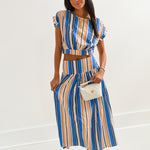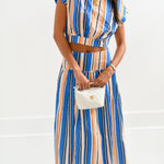 This Sara Midi Skirt Set in vibrant orange and blue offers a flattering bubble top cropped design paired with a midi-length skirt. The set combines stylish comfort and versatility, making it an ideal choice for warm-weather outings or casual gatherings. Its unique silhouette enhances your natural shape while providing ease of movement throughout the day. Perfect for those seeking a chic yet comfortable outfit that supports confidence and effortless style.