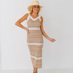 The Savannah Ribbed Knit Midi Dress in Light Taupe is the perfect mix of style and comfort. Featuring a flattering striped v-neck, self tie shoulder straps, and a side slit detail, this dress is sure to turn heads. Made from a soft ribbed knit material, it will keep you feeling comfortable all day while still looking chic. Elevate your wardrobe with this versatile dress.