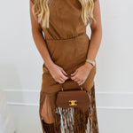 The Saylor Astelle midi dress is crafted from faux suede fabric. This A-line, midi dress features a fringe trim at the skirt, a zipper at the center back, and shank button detailing at the center back of the neck.