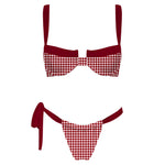 This bikini set features a classic gingham pattern in red and white, exuding a charming picnic vibe. The ensemble includes a structured top with supportive straps and a matching mid coverage bottom, both accented with delicate bow details. Perfect for summer outings.